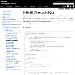 If you use the INSERT , UPDATE , and DELETE statement individually, you have to construct three separate statements to update the data to the target table with the matching rows from the source table. Runs insert, update, or delete operations on a target table from the. Blog › CodeProject Kopia Podobne Tłumaczenie strony Introduction to the MERGE Statement and SQL Server Data Modification.